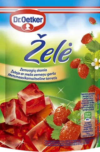Agrastų skonio, bananų skonio bei žemuogių skonio želė paruoškite, kaip nurodyta ant pakuotės, supilkite į tris skirtingus indelius ir padėkite sustingti šaldytuve.